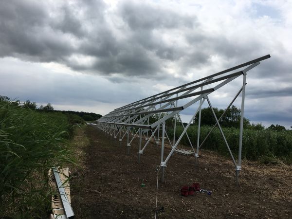施工ではまず、スクリュー杭をユンボで打ち込み、レーザーレベルでミリ単位の高さ調整を行いました。これは太陽光工事における最も重要な工程のひとつで、精度が発電効率や耐久性に直結します。架台は豪雪地域仕様で、地面からパネルの最下部まで150cm、一番上は350cmを超える高さを確保。これにより積雪時もパネルが埋もれず、長期的な安定稼働が可能です。