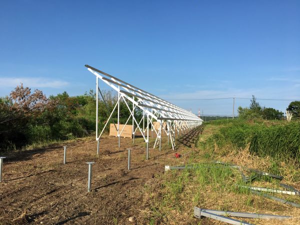 スクリュー杭をユンボで打ち込む風景です。レーザーレベルですべての杭の高さを合わせてミリ単位で施工する太陽光工事の中で最も重要な作業です。
