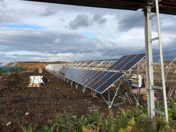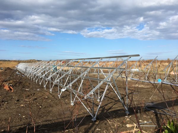 架台の骨組み状況です。写真の通り周囲に何もなく日没ぎりぎりまで太陽が当たります。