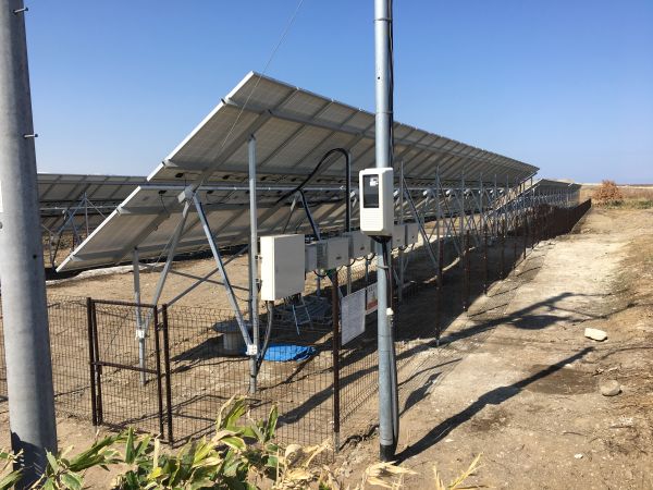 後ろからの風景です。道路沿いに終電箱とパワコンを集約させています。フェンスは豪雪地域であるため、強度の高いものを採用しました。