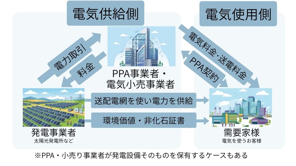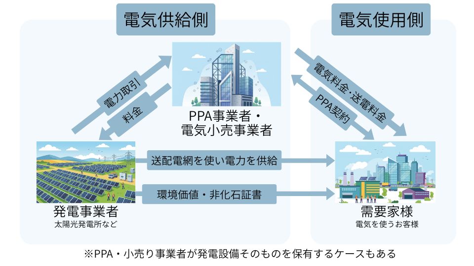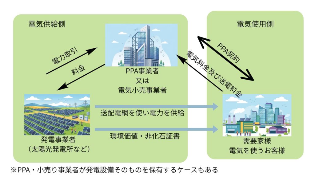 需要家が自社の敷地外に設置された再生可能エネルギー発電事業者(主に太陽光発電)から、送配電網(送配電事業者)を通じて電力を長期・固定価格で購入する仕組みです。発電設備は発電事業者が保有・運用するため、企業は初期費用やメンテナンス負担なしで、再生可能エネルギーと環境価値を同時に導入できます。